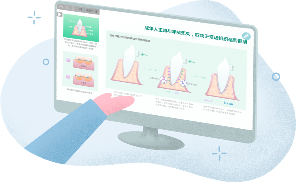 预置的图文素材,由北大口腔各科室老师审核,按治疗项目分类,保持专业度的同时,更加易懂,帮您有效讲解牙科知识