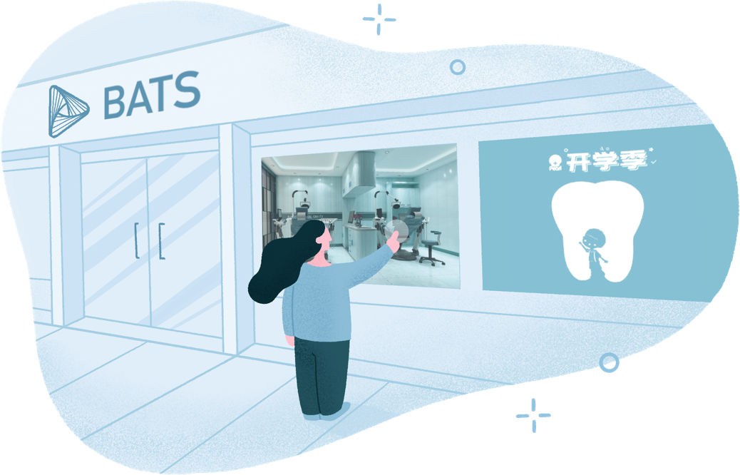借助短焦激光投影设备,可投放于临街玻璃窗,定时开启关闭,轮播门诊信息、店内活动和口腔科普等,吸引附近居民后,触摸玻璃实时交互,集营销与服务一体